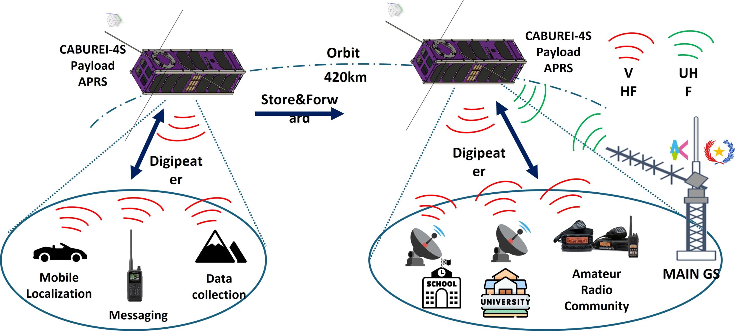 The Caburei mission is an Automatic Packet Reporting System (APRS) payload designed to support communication through the amateur radio community. It operates in both store-and-forward and digipeating modes, allowing packets to be received, temporarily stored, and retransmitted to extend communication range.